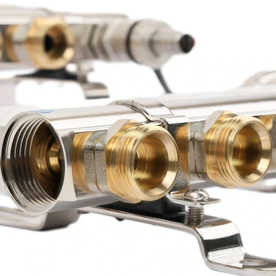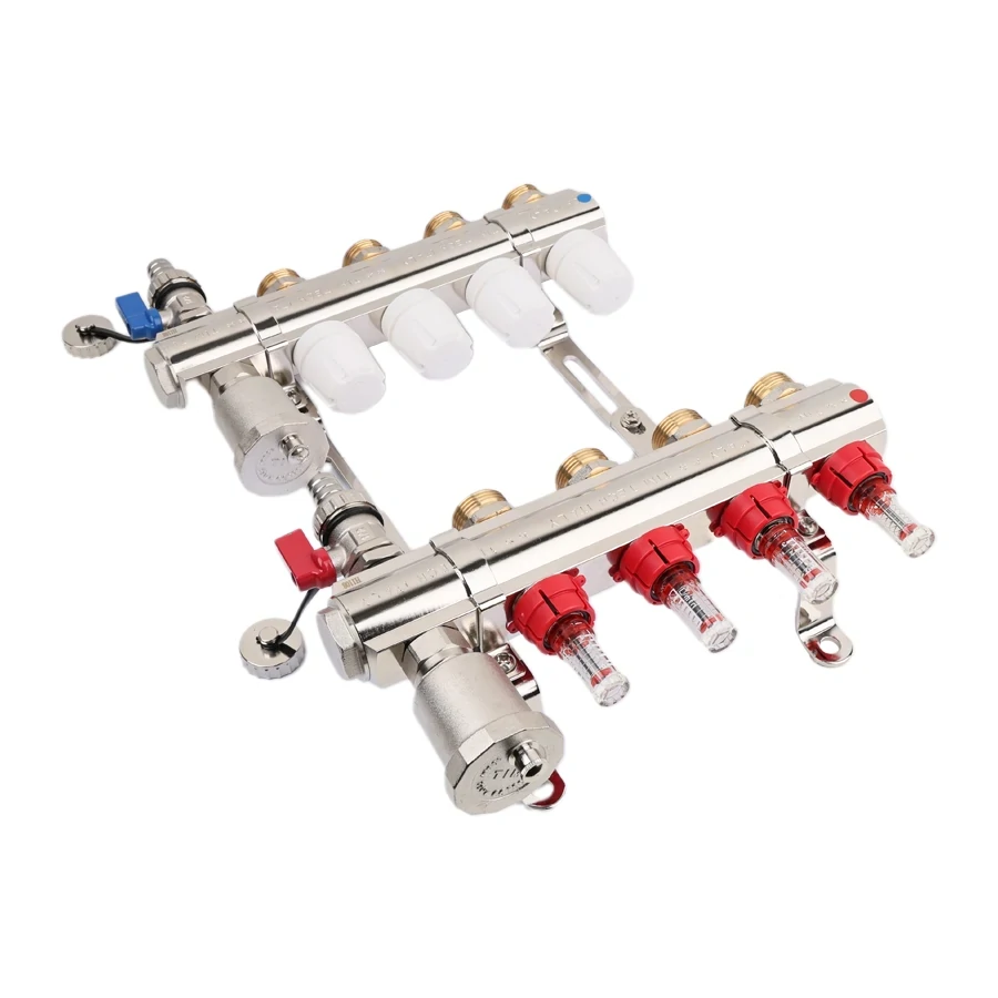 Коллекторный блок служит для распределения потоков по контурам теплого пола, где в качестве теплоносителя используется вода либо незамерзающие растворы гликоля с максимальной рабочей температурой 70 °C, рабочим давлением до 6 бар