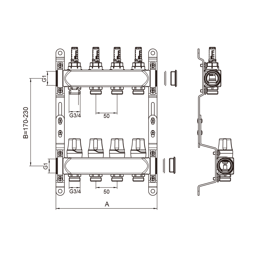 Выходы от 3 до 12 с соединением 3/4” Евроконус. Межосевое расстояние: 50мм.