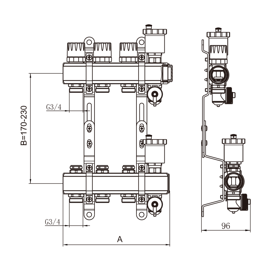 Коллекторный блок служит для распределения потоков по контурам теплого пола, радиаторного отопления, прочих климатических систем, где в качестве теплоносителя используется вода либо незамерзающие растворы гликоля с максимальной рабочей температурой 90 °C, рабочим давлением до 10 бар